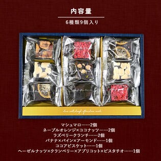 - 9個(マシュマロ×2個、ネーブルオレンジココナッツ×2個、ラズベリークランチ×2個、バナナパインアーモンド×1個、ココアビスケット×1個、ヘーゼルナッツクランベリーアプリコットピスタチオ×1個)