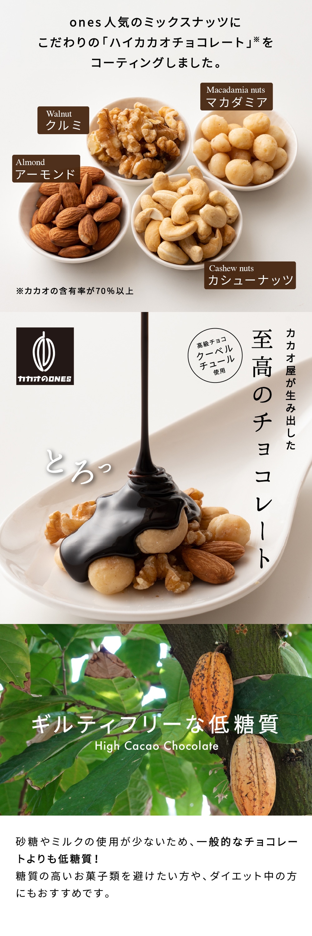 ・原材料/材質/素材:チョコレート(カカオマス、砂糖、ココアバター、全粉乳)(国内製造)、くるみ、アーモンド、カシューナッツ、マカダミアナッツ、ココアパウダー/乳化剤、香料、(一部に乳成分・くるみ・アーモンド・カシューナッツ・マカダミアナッツ・大豆を含む)
