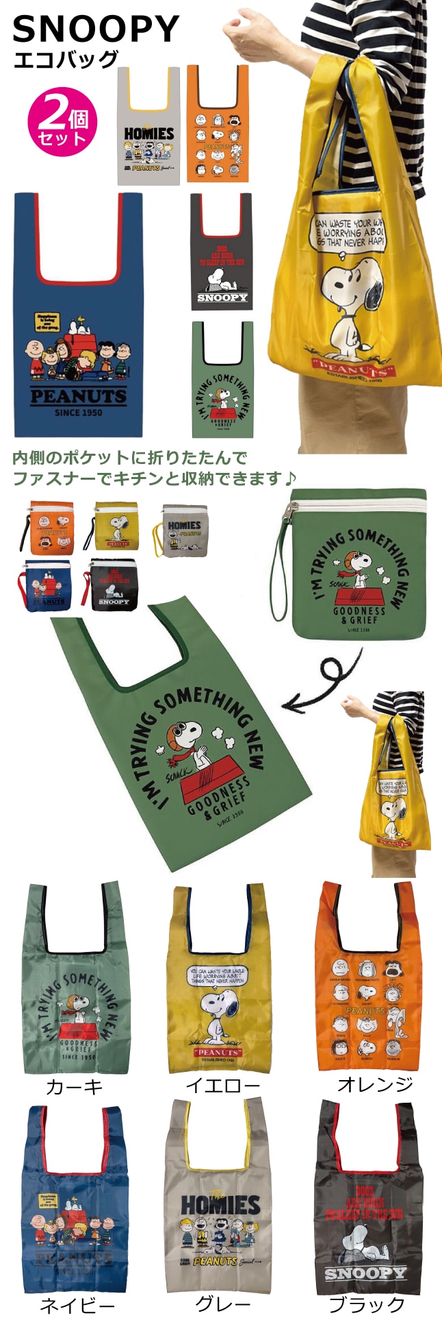 - 【2個セット:ネイビー+他1色】スヌーピー折りたたみエコバッグ