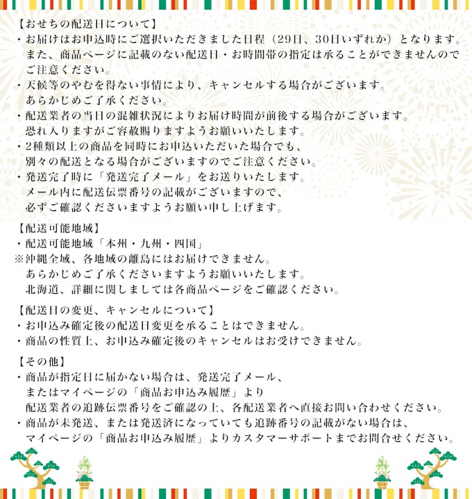 ・配送日時の指定:「発送予定日」に配送日指定の記載がある場合に、ご利用可能です。