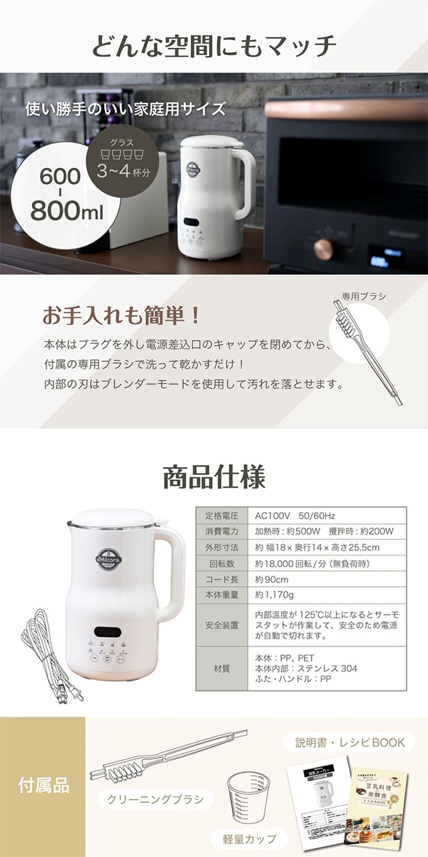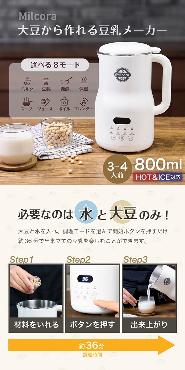 Milcora 自家製豆乳メーカー(選べる8モード:スープ、発酵モードなど/10枚刃/レシピ付) | 大豆まるごと使って栄養満点!美味しいヘルシー豆乳!必要なのは水と大豆のみ!