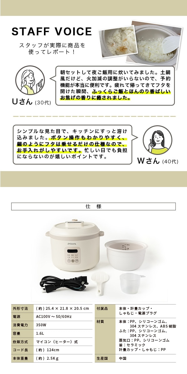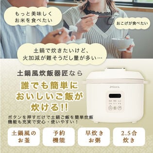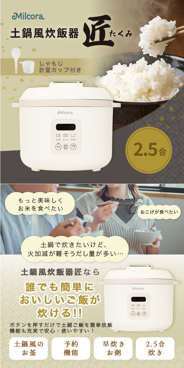 - Milcora 土鍋風 炊飯器「匠」(2.5合炊き/予約機能/しゃもじ/計量カップ付き)