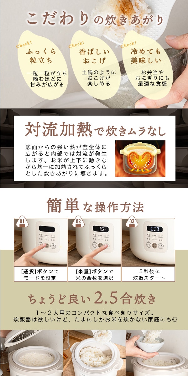 Milcora 土鍋風 炊飯器「匠」(2.5合炊き/予約機能/しゃもじ/計量カップ付き) | 冷めても美味しい!ふっくら粒立ち!土鍋のようにおこげが楽しめる!誰でも簡単おいしいご飯を。