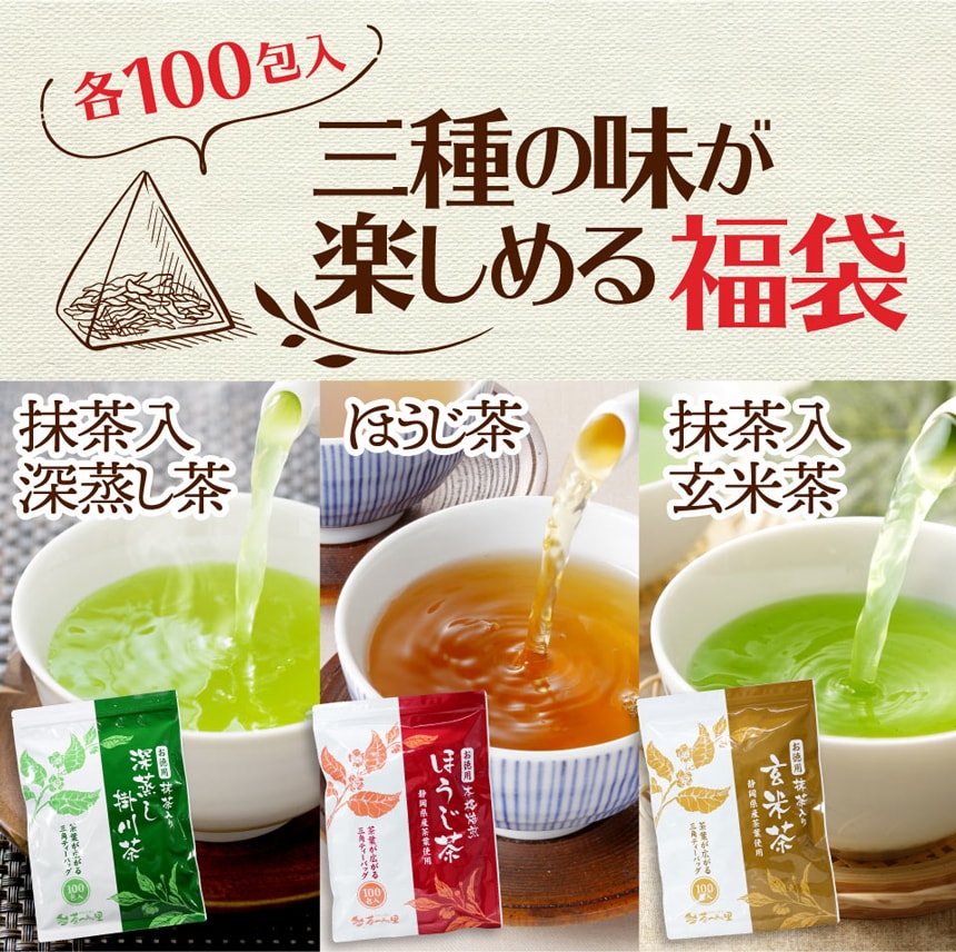 【3種/100包入×各1袋】 茶つみの里 緑茶・ほうじ茶・玄米茶 ティーバッグ 大容量 | 計300包の超特大福袋!3種の味が楽しめる ティーパックセット 深むし茶 掛川茶 人気