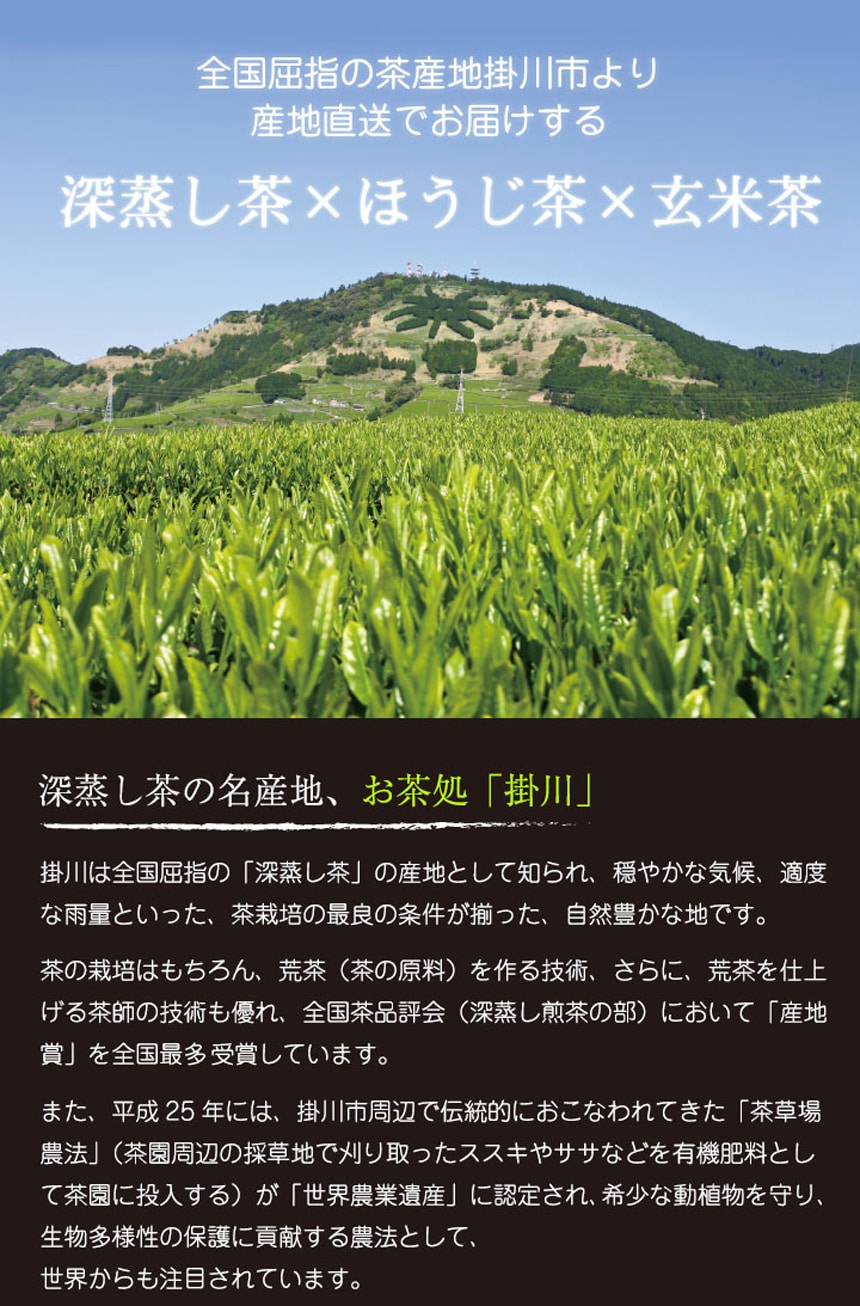 深蒸し掛川茶、ほうじ茶、抹茶入り玄米茶のお得なセットです。