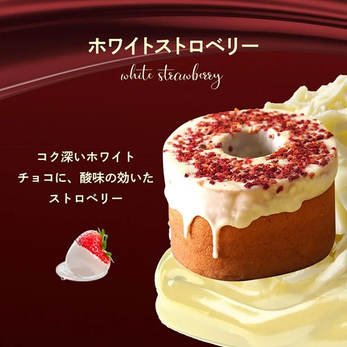 ホワイトストロベリー:液卵(国産)、砂糖、小麦粉、マーガリン、コーンスターチ、オリゴ糖、チョコレート、乾燥イチゴ、牛乳、食塩/乳化剤、香料(一部に卵・小麦・乳成分・大豆を含む)
