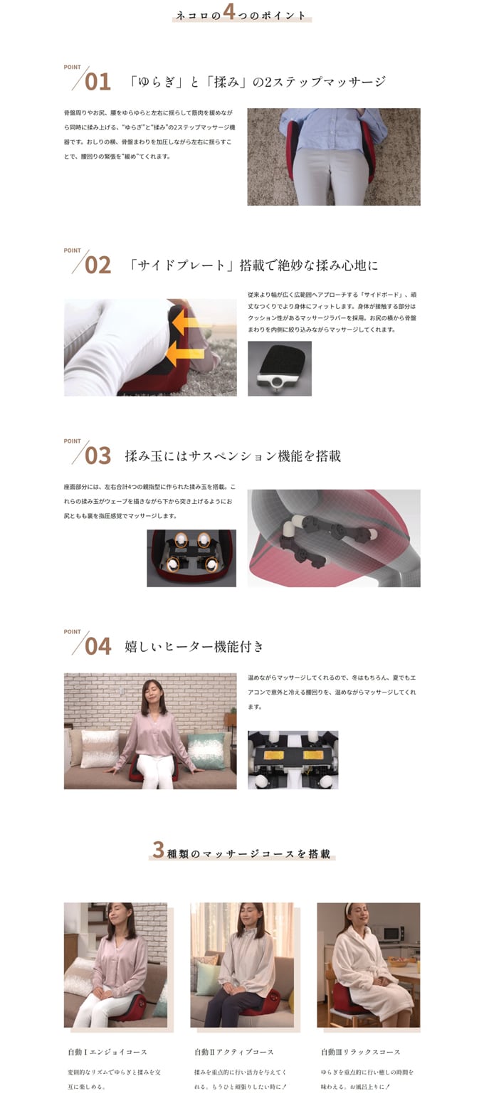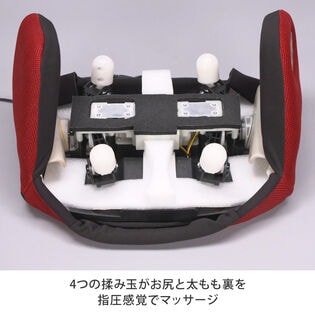 4つのモミ玉と両サイドの揉みボードで、お尻や腰、太もも等をしっかりともみほぐします。ヒーター機能も搭載されているため、温めながらマッサージが可能です。