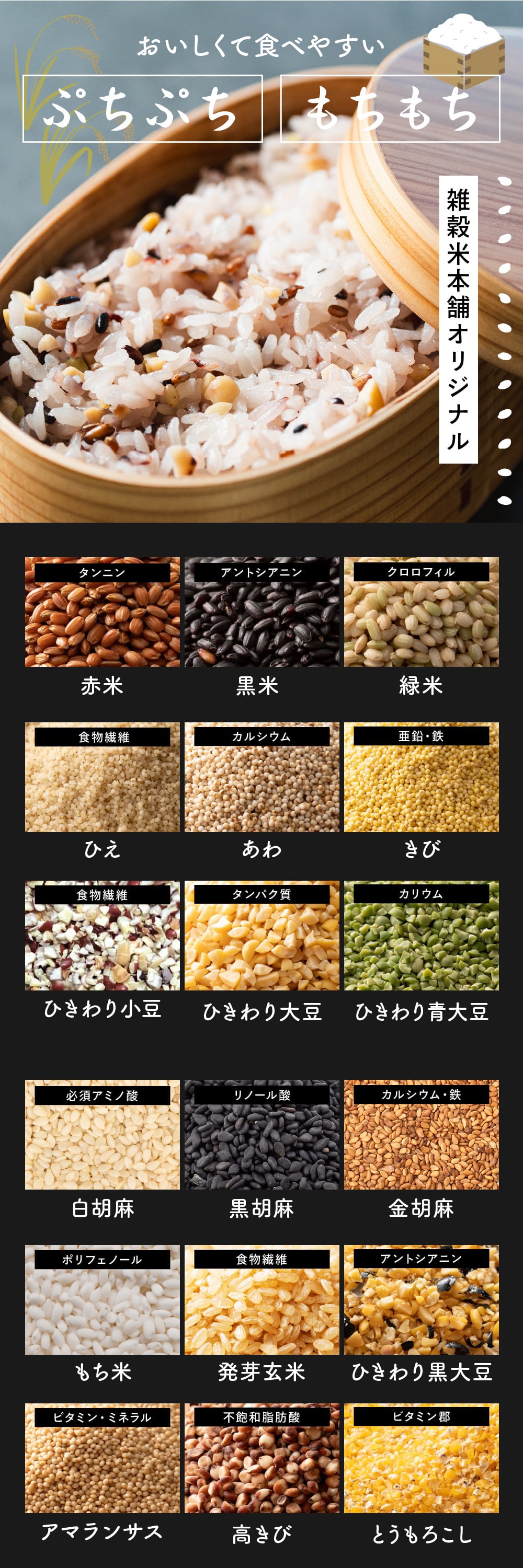 ・原材料/材質/素材:黒米、大豆、もち米、赤米、発芽玄米、青大豆、緑米、小豆、きび、黒大豆、ひえ、高きび、とうもろこし、あわ、アマランサス、白胡麻、黒胡麻、金胡麻、(一部に大豆・ごまを含む)