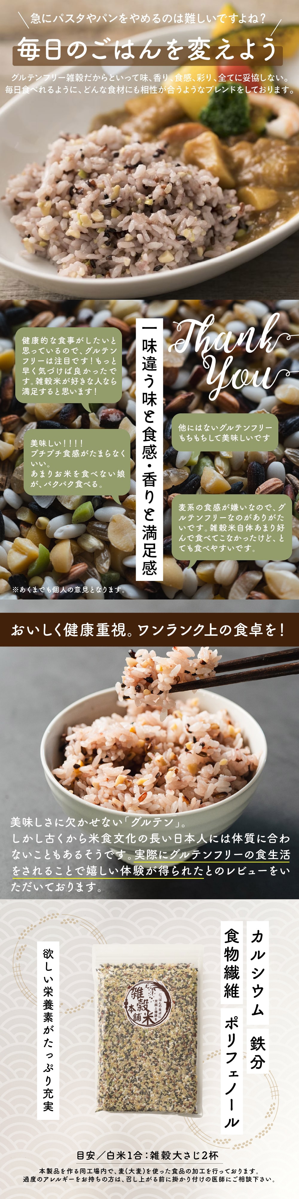 美味しく健康的にワンランク上の食卓を演出してくれるような今までなかった雑穀米です。グルテンフリー雑穀だからといって味、香り、食感、彩り、全てに妥協しない!毎日食べれるように、どんな食材にも相性が合うようなブレンドをしております。雑穀専門店だから作れる、お客様が求める要望に沿った雑穀米を是非ご賞味下さい。