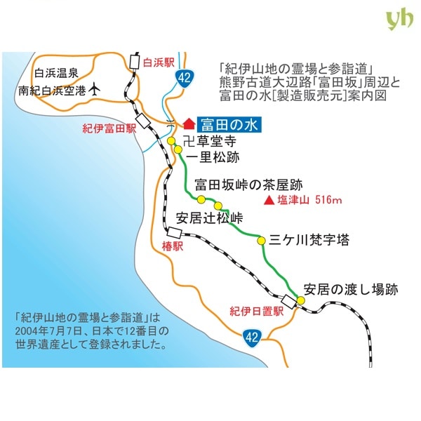 南紀白浜 富田の水の採水地は、和歌山県の「紀伊山地の霊場と参詣道」として2004年7月7日、日本で12番目の世界遺産に登録された熊野古道の一つ、大辺路街道 富田坂入口より2キロほど奥へ入った地点、環境汚染を引き起こしそうなものが一切存在しない熊野連山のふもと高瀬川沿いに位置します。