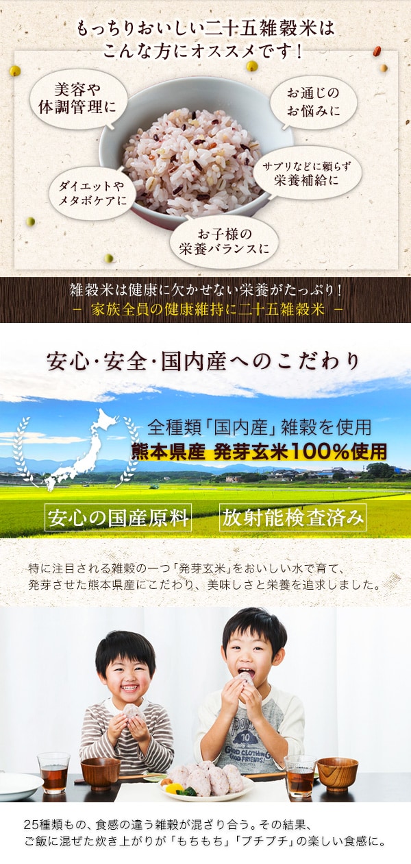 ・原材料/材質/素材:丸麦、青肌玄米、もち黒米、胚芽押麦、もち玄米、もち赤米、もち麦、 米粒麦、挽き割り大豆、挽き割りとうもろこし、発芽玄米、発芽もち玄米、黒千石、えごま、発芽もち黒米、アマランサス、たかきび、はと麦、うるちあわ、挽き割り青大豆、挽き割り小豆、ひえ、緑米、もちあわ、もちきび