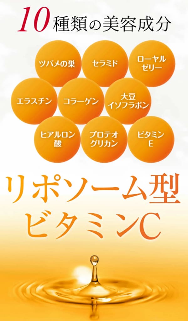 その他美容成分として、ツバメの巣、セラミド、ローヤルゼリー、エラスチン、コラーゲン、大豆イソフラボン、ヒアルロン酸、プロテオグリカン、ビタミンEを配合。