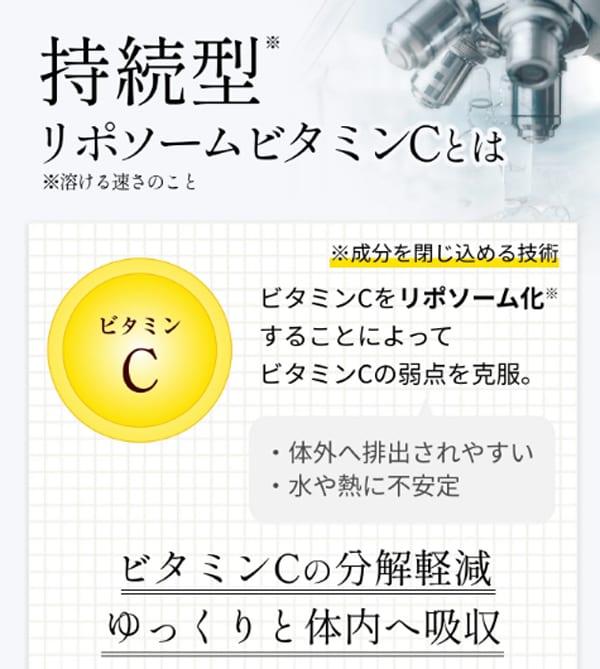 ビタミンCをリポソーム化*することにより、溶け方がゆっくりになるとともに