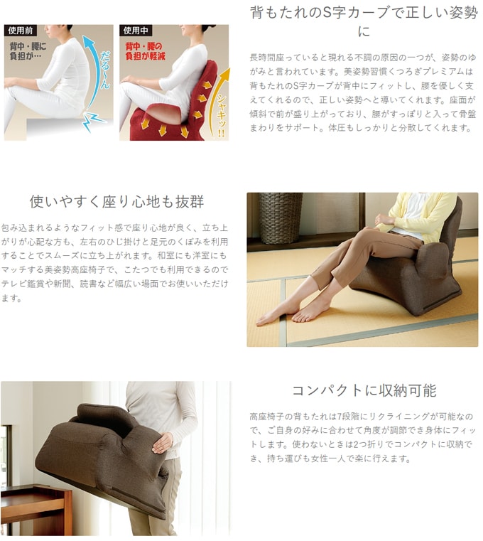 美姿勢習慣くつろぎプレミアムは、医学博士の勝野浩先生が監修し、人間工学に基づいた構造で座る時の姿勢を正して健康を維持する機能性高座椅子です。背もたれのS字カーブが背筋にピッタリとフィットし、使用時の美姿勢を保ちます。座面は前方が高くなっており、腰や骨盤まわりをサポートしながら体圧が分散されるので心地の良い座り心地!オーバーハング構造を採用しているので、くぼみにかかとを入れて踏ん張ることができ立ち上がりもラクラク。背もたれのリクライニング機能は7段階、使わないときは2つ折りでコンパクトに収納できます。