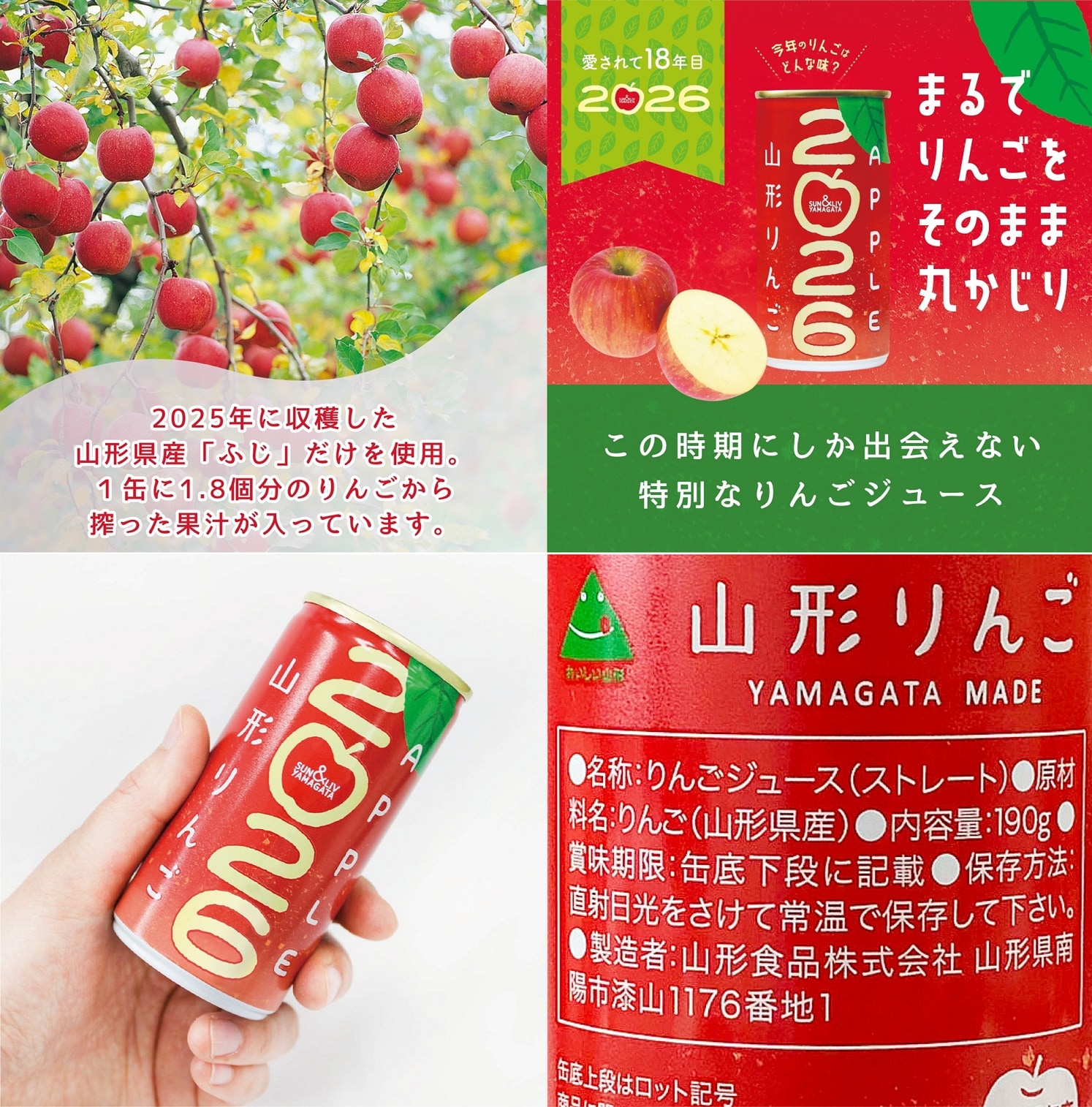 【190g×30本】SUN&LIV山形りんご2026/ストレート果汁100%りんごジュース/アップル | 砂糖、香料、着色料、酸化防止剤不使用!原料は2025年山形県産りんご「ふじ」だけ。馬年正月