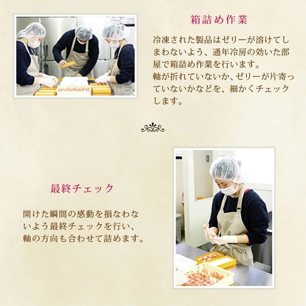 山形の果樹園で育ったさくらんぼの果実を、ひと粒ひと粒ていねいに種を取り、優しくゆっくり蜜煮をしてから、宝石のような丸い綺麗なゼリーで包みました。