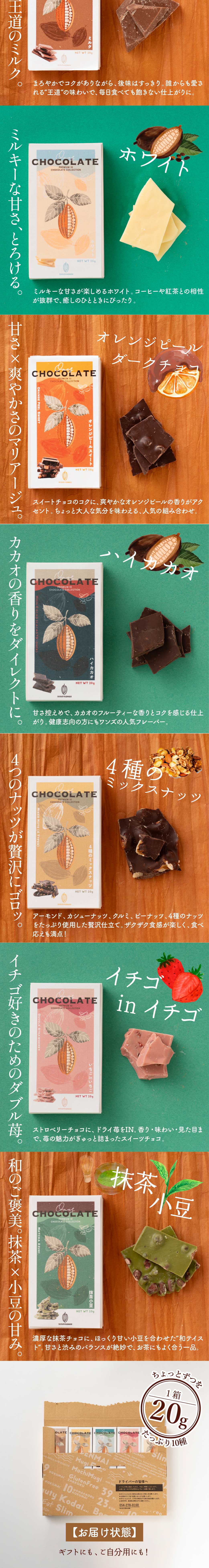 ハイカカオ、ホワイト、ミルク、スイート、オレンジピール、抹茶小豆、イチゴinイチゴ