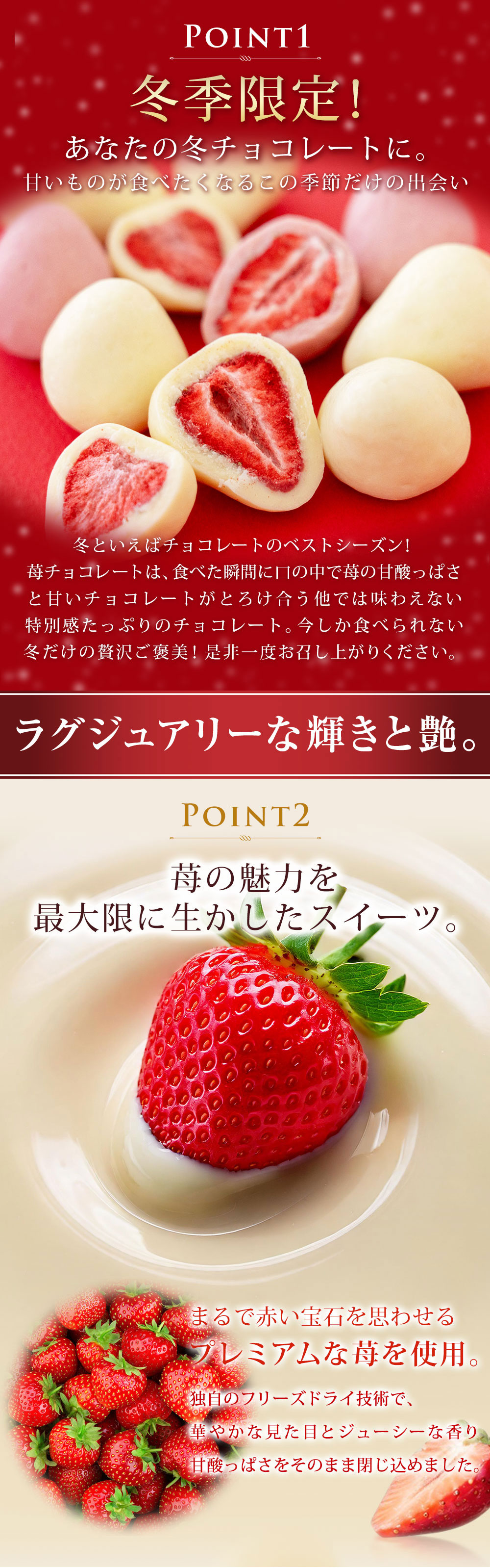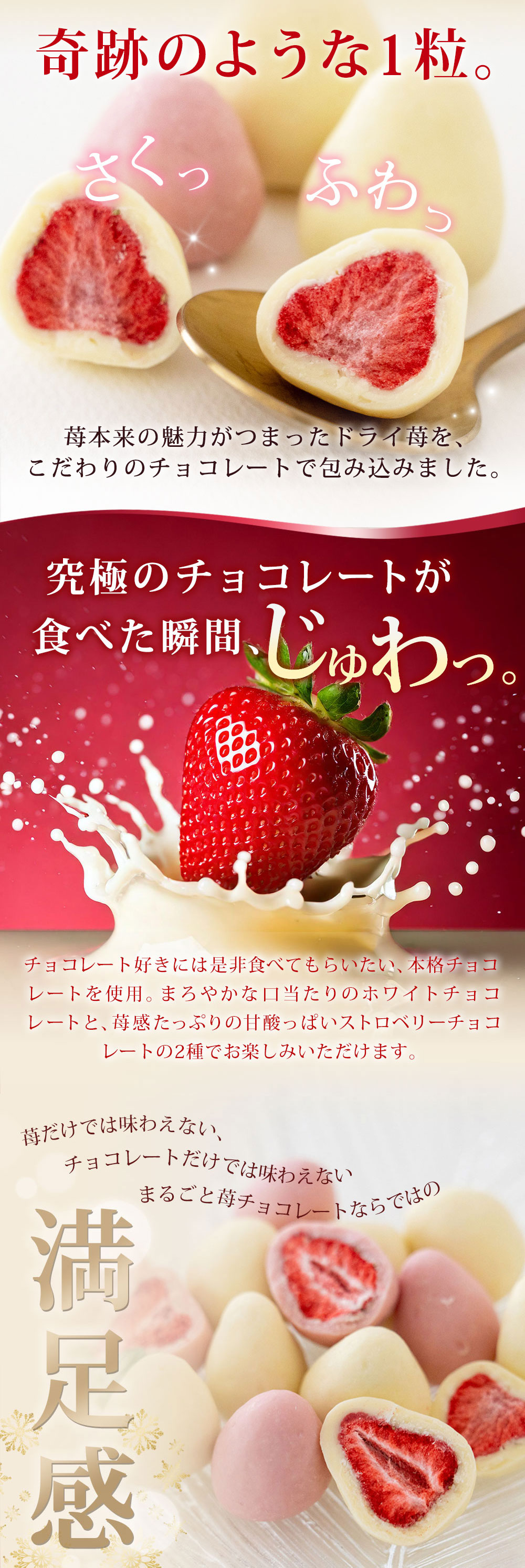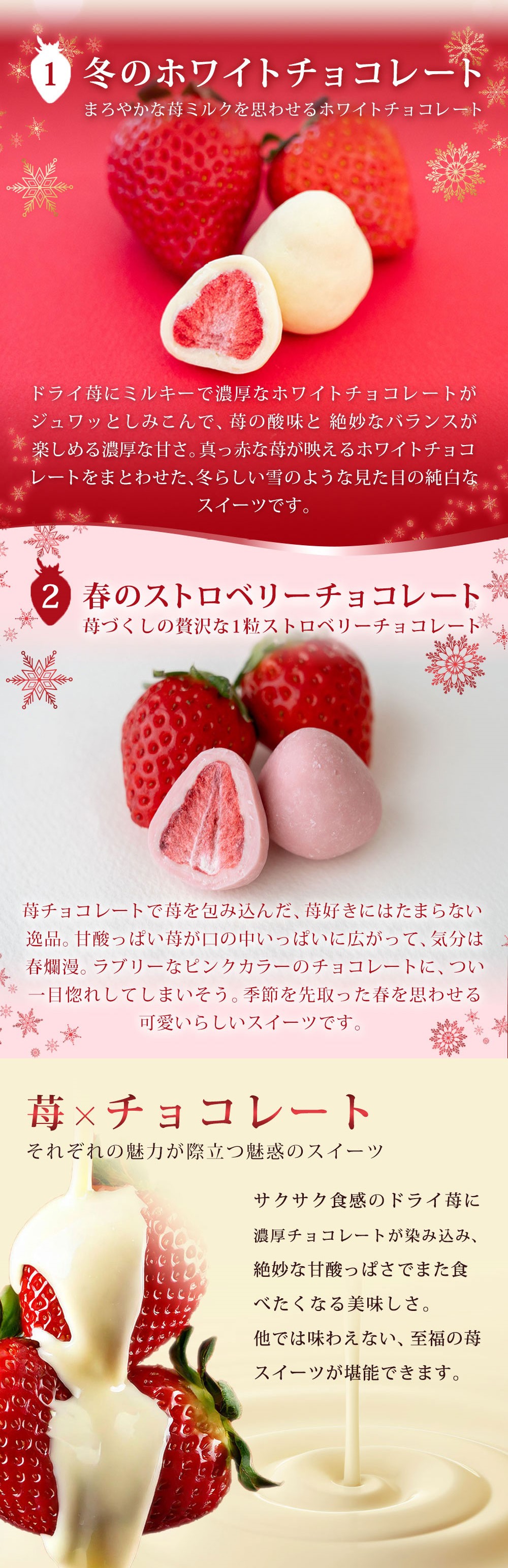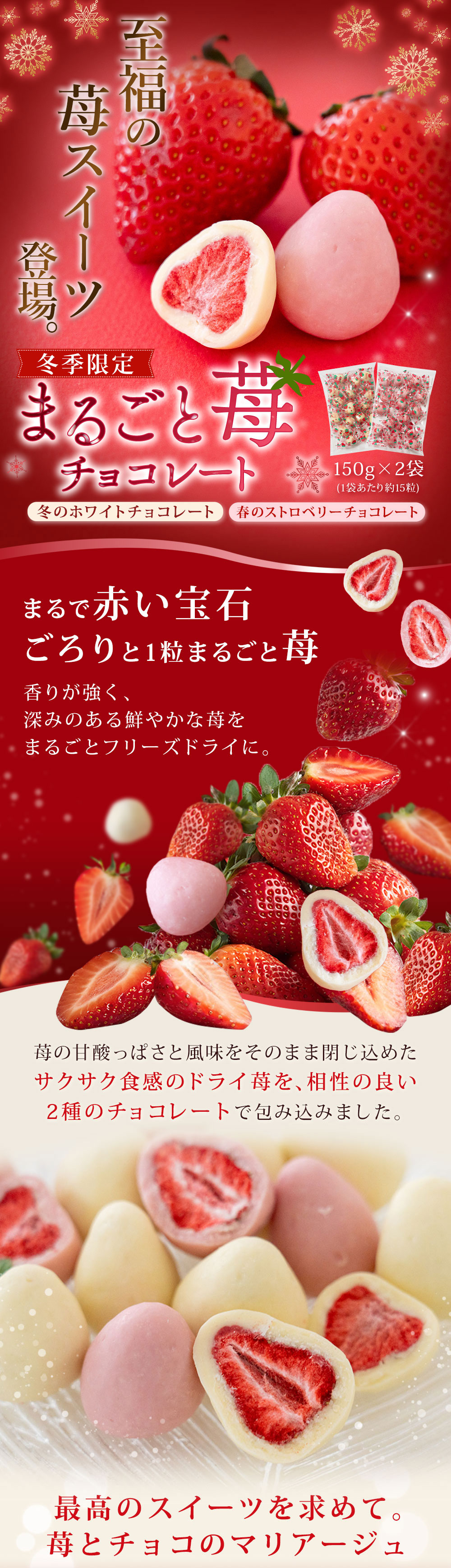 【季節限定】【2種/計300g】まるごと苺チョコレート【常温便】 | 甘ずっぱさと風味をそのまま閉じ込めたサクサクドライ苺を、相性の良いチョコで包みこみました