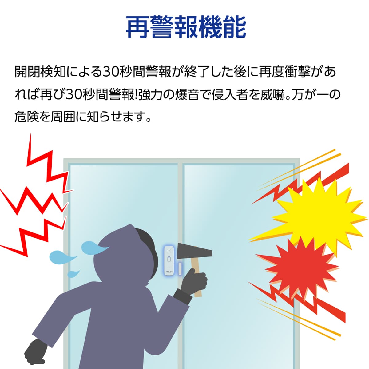 【2個セット】窓用防犯ブザー(ダブル感知タイプ/両面接着ステッカー付/厚さ8.5mm/工事不要) | 窓に貼るだけ!ガラスの破壊や衝撃、更に窓の開閉も感知!ガラスに異変を感じた瞬間、すぐに守る