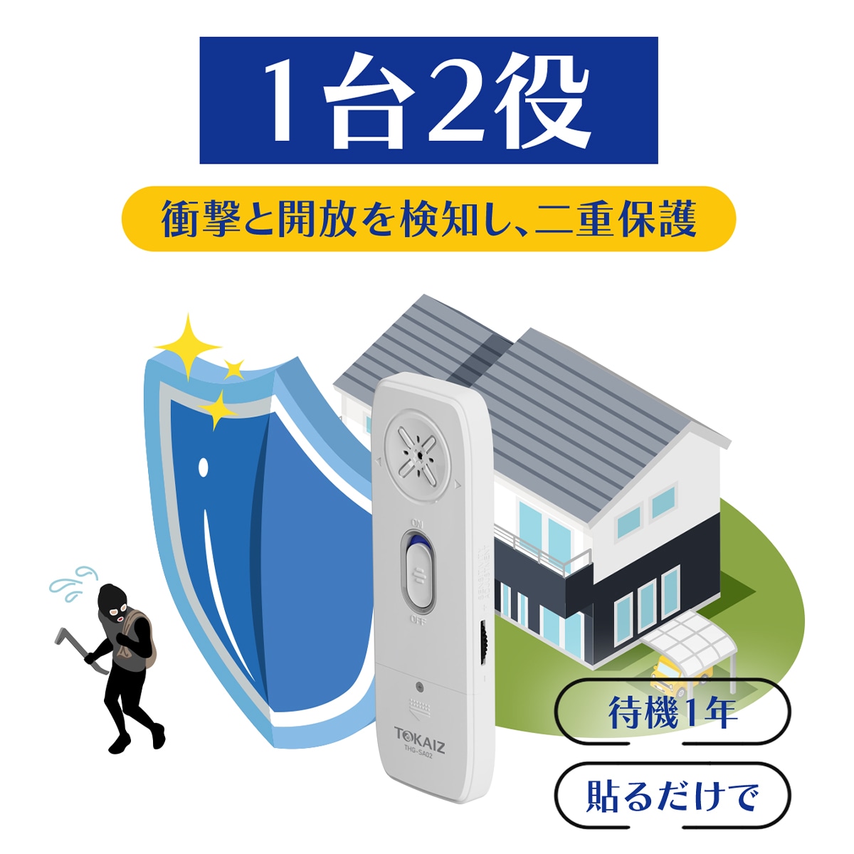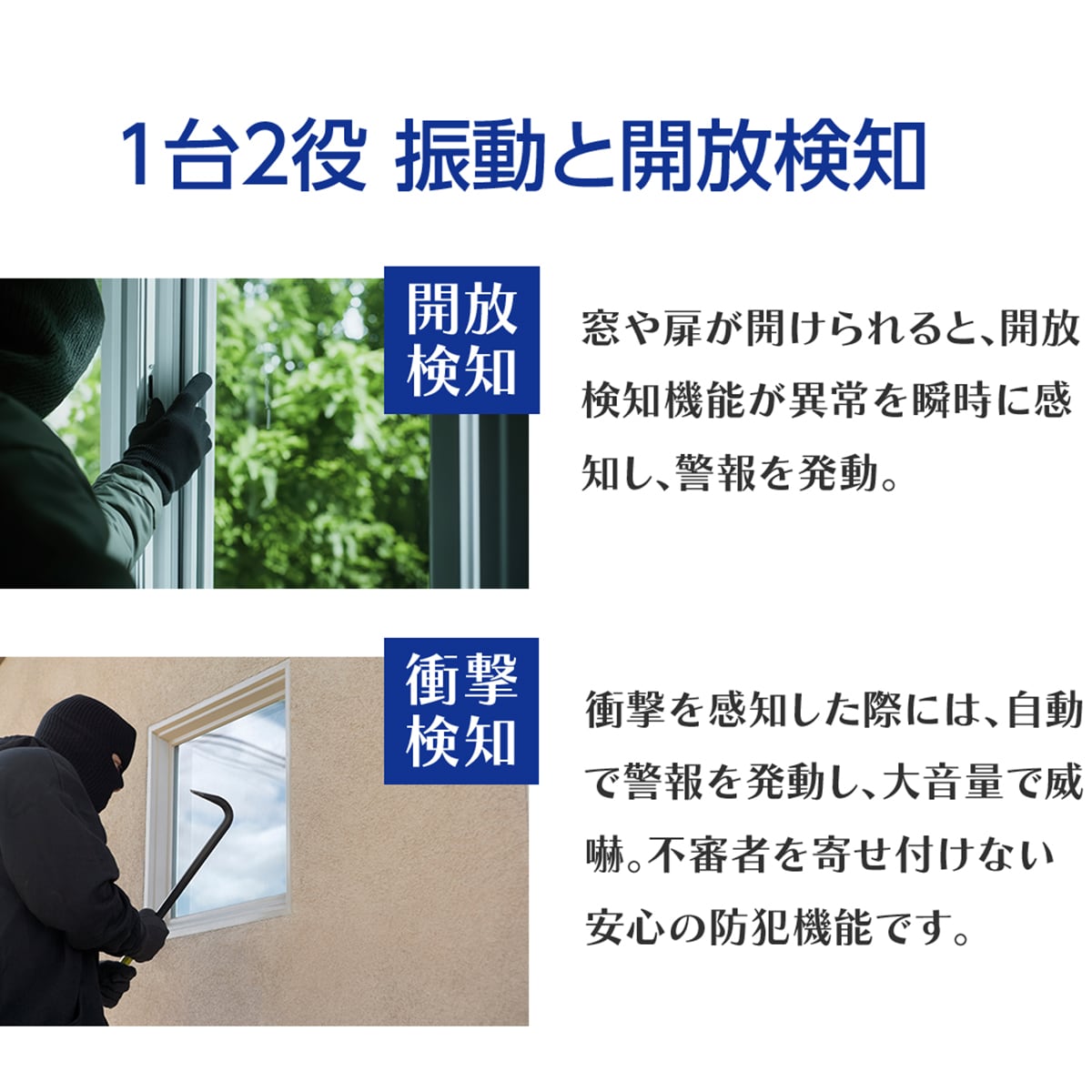 薄型設計でほとんどの窓に対応、空き巣対策に最適な防犯パートナー。開放検知と衝撃検知のダブル機能を搭載し、電池交換不要で1年間使える手軽さと爆音アラームで家族の安全を守ります。