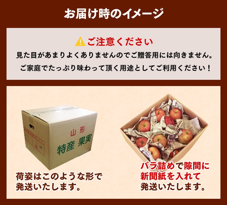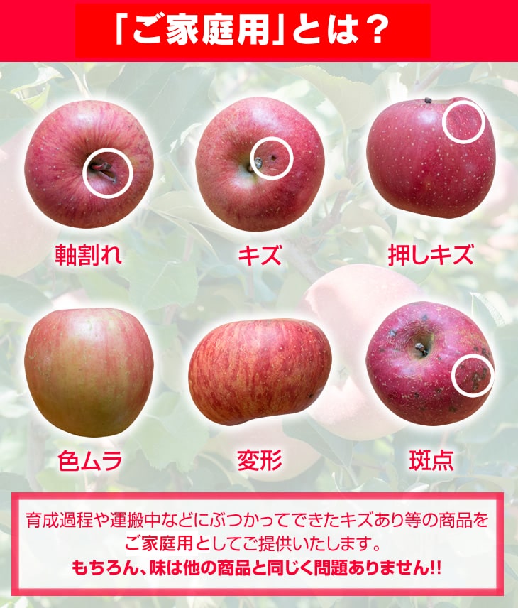 すり傷・押傷・小玉・軸割れ・色むら、斑点のため、贈答用には向きません。ご家庭でお召し上がりください。