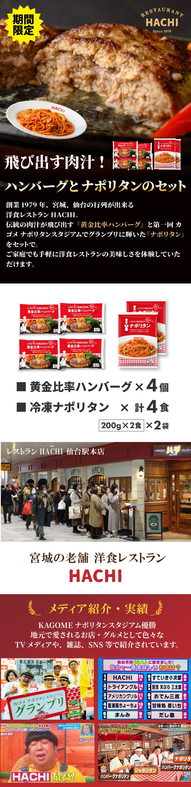 - 【期間限定】ハチの黄金比率ハンバーグ 130g×4個 ナポリタン2袋(4食)セット