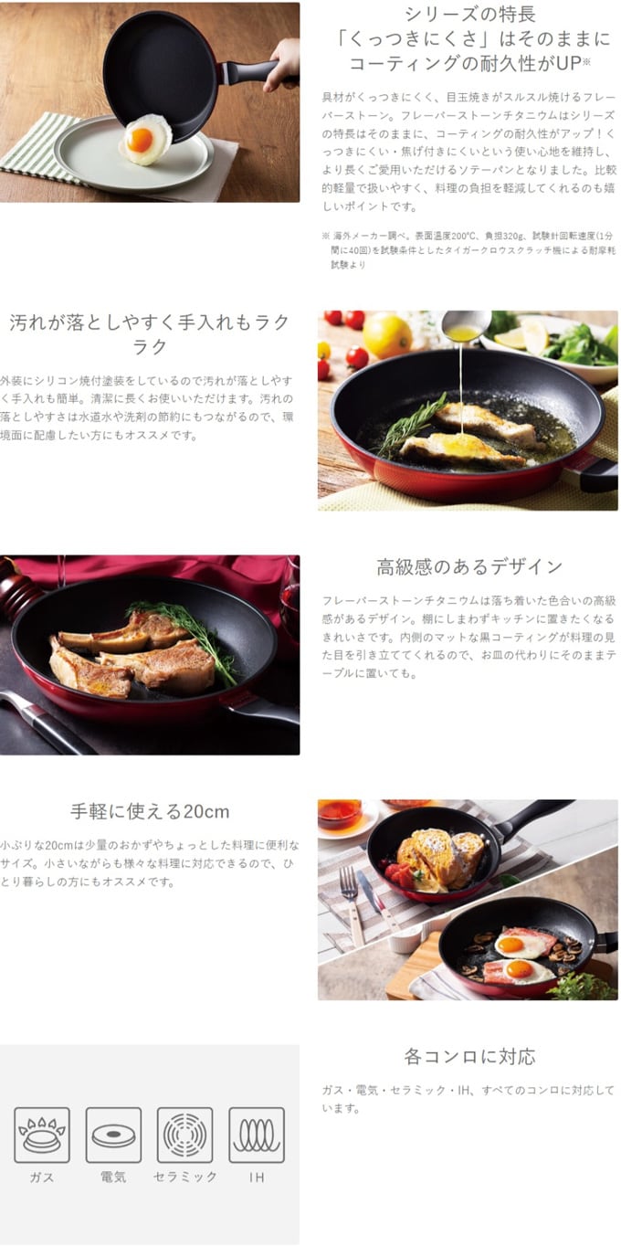 シリーズ世界累計販売数1,400万枚突破!※1世界中で大人気のフレーバーストーンシリーズから、耐久性に優れたモデルが登場!余分な油を使わず、美味しくヘルシーな調理が可能なフレーバーストーン。性能はそのままに何度も長期間使いたい!という方にはフレーバーストーンチタニウムがオススメです。フレーバーストーンチタニウムはシリーズの特長「くっつきにくさ」はそのままにコーティングの耐久性がアップ!※2日常的に料理する方にピッタリのフライパンとなりました。さらに外装にはシリコン焼付塗装をしているので、汚れが落としやすく手入れもラクラク。見た目も落ちついた色合いで高級感があり、キッチンや食卓を華やかにしてくれます。多重構造なのに比較的軽量で扱いやすく、料理の負担を軽減してくれるのも特長です。フレーバーストーンチタニウムで、ヘルシーで健康的な食卓をつくりませんか。