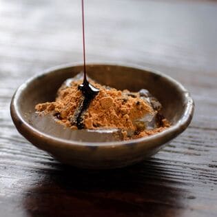 ・お召し上がり方:2~3時間ほど冷蔵庫で冷やしていただき、お皿にきな粉を半分広げるように出します。その上にわらび餅を取り出して上から残りのきな粉をかけます。お好みで黒蜜をかけてください。スプーンですくいきな粉とまぜながら お召し上がりください。