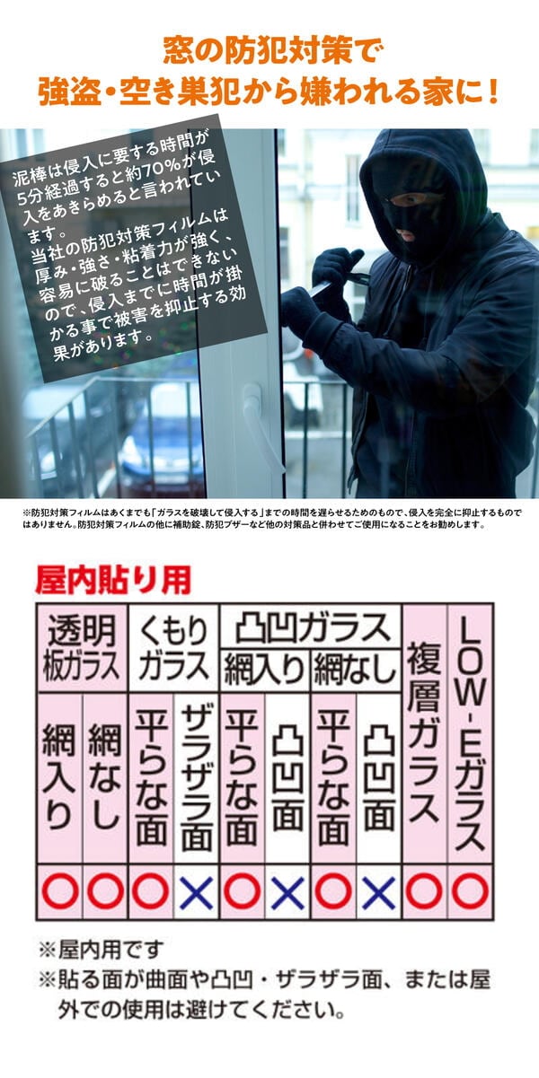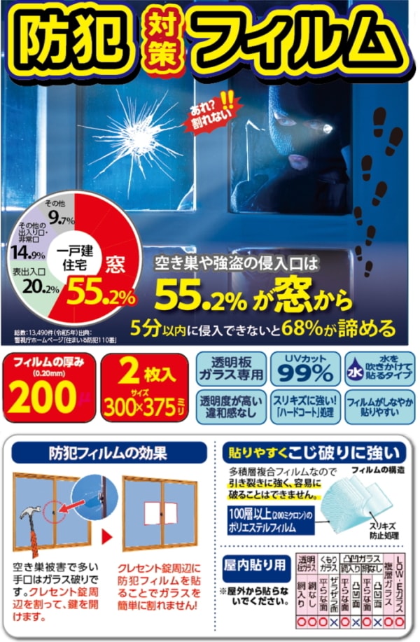 防犯フィルムは、窓ガラスに貼ることで泥棒の侵入を遅らせることで侵入を防ぐアイテムです。