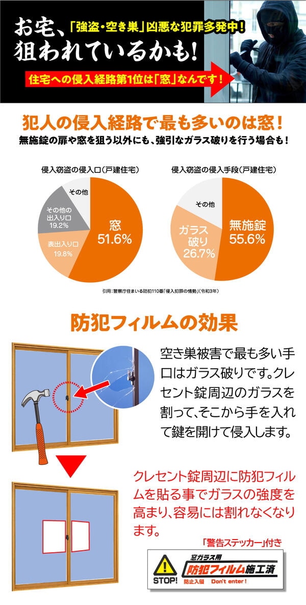 泥棒の半数以上は窓から侵入しているため、窓の防犯性能を高めることは非常に重要です。