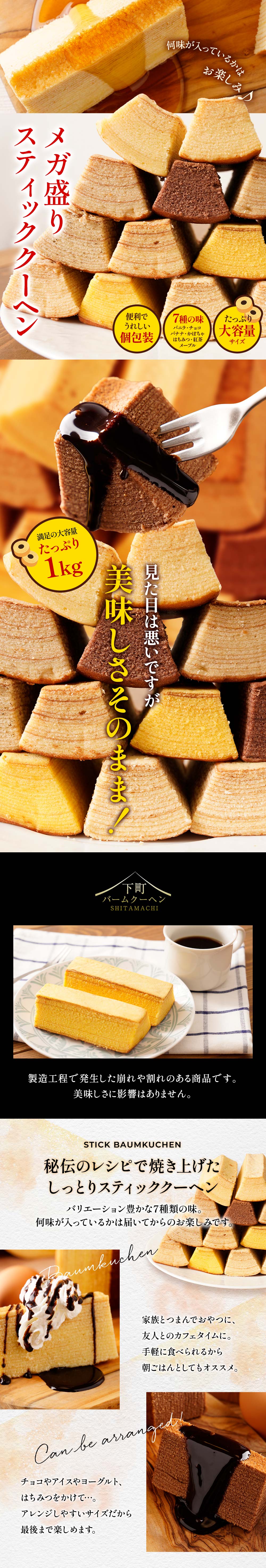 - おもいきり食べられる下町バームクーヘンの秘伝のレシピで焼き上げたしっとりスティッククーヘン!1kgの超ボリューム!!