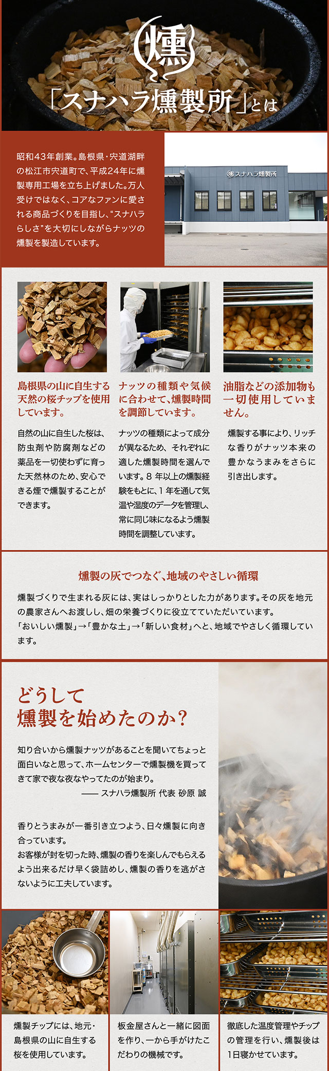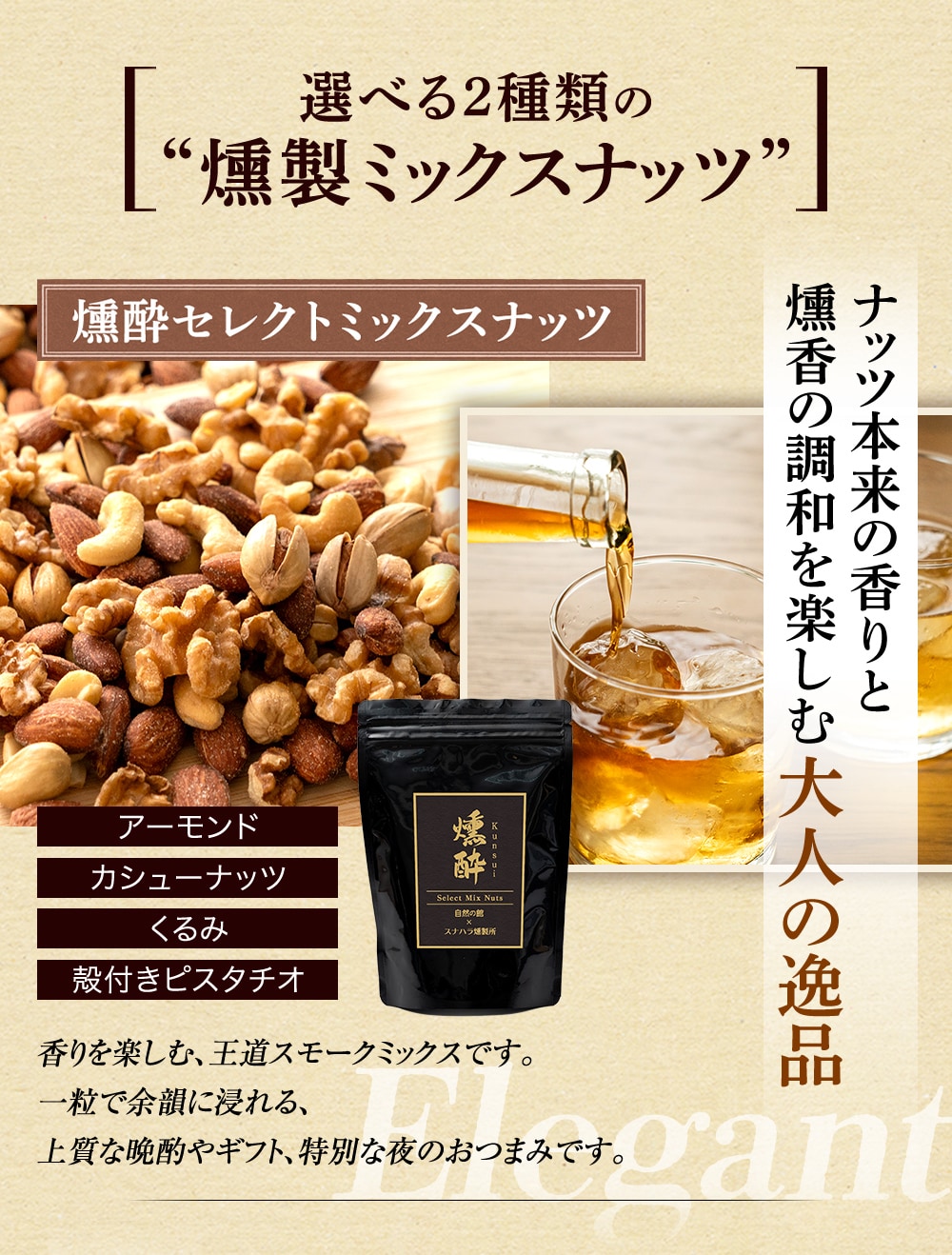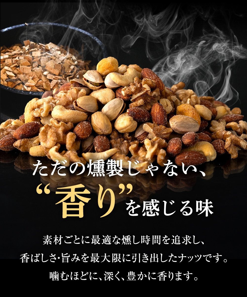 燻製アーモンド(アーモンド(アメリカ)、植物油、食塩)、燻製くるみ、燻製カシューナッツ(カシューナッツ、植物油、食塩)、燻製ピスタチオ(殻付きピスタチオ、食塩)、食塩/調味料(アミノ酸等)