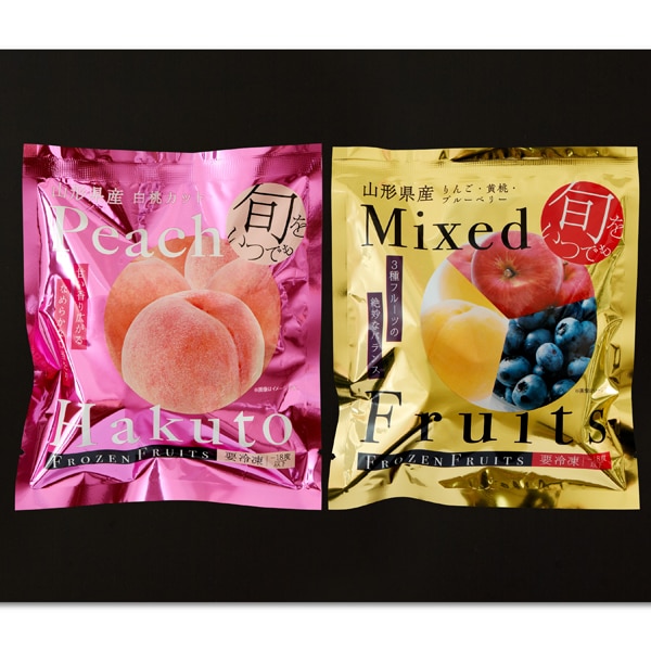 山形で育った完熟の白桃と、山形で育ったりんごと黄桃、ブルーベリーをミックスしたパックの2種を、一番おいしい旬のタイミングで、急速冷凍しました。半解凍でシャーベットでお召し上がりいただくほか、ジュースやお酒の氷の代わりとして、スムージーやデザートのトッピングなど、フルーツ本来の香りや甘さをお楽しみください。