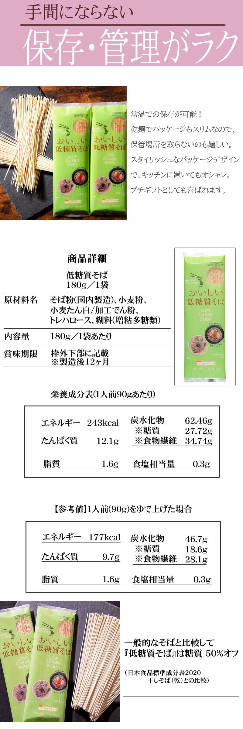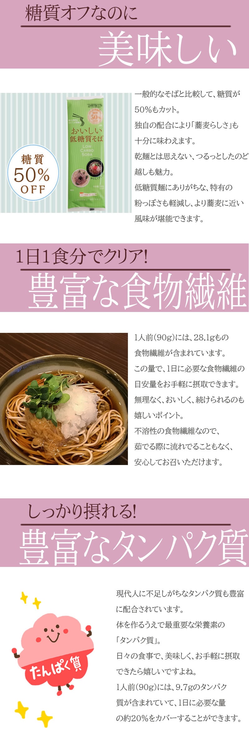「麺らしさ」をのこしつつ、一般的なそばと比較して糖質を50%カット。