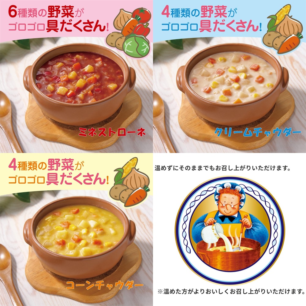 クレアおばさんシリーズならではの、素材の味を活かしたやさしい味わいが特長で、野菜や豆、肉などの具材がたっぷり入っているため、満足感のある一杯に仕上がっています。