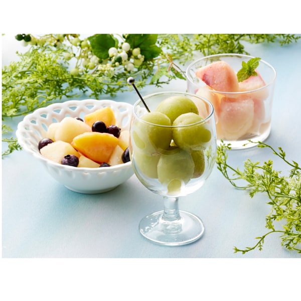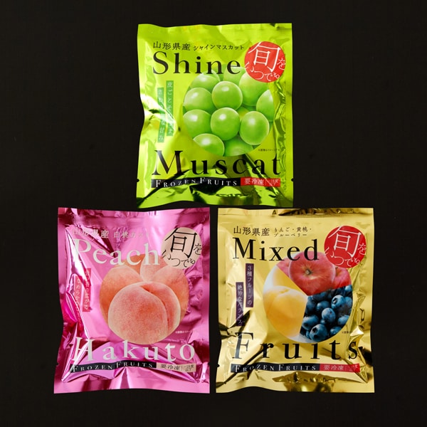 山形で育った皮ごと食べられる大粒のシャインマスカットと、完熟の白桃、それとりんごと黄桃、ブルーベリーをミックスしたパックの3種を一番おいしい旬のタイミングで、急速冷凍しました。半解凍でシャーベットでお召し上がりいただくほか、ジュースやお酒の氷の代わりとして、スムージーやデザートのトッピングなど、フルーツ本来の香りや甘さをお楽しみください。