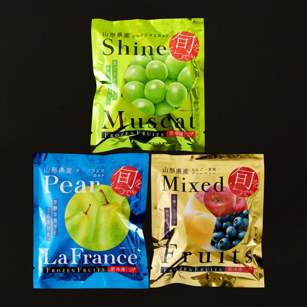 山形で育った皮ごと食べられる大粒のシャインマスカットと、歯触りのいい甘くてジューシーなラ・フランス(洋ナシ)、それとりんごと黄桃、ブルーベリーをミックスしたパックの3種を一番おいしい旬のタイミングで、急速冷凍しました。半解凍でシャーベットでお召し上がりいただくほか、ジュースやお酒の氷の代わりとして、スムージーやデザートのトッピングなど、フルーツ本来の香りや甘さをお楽しみください。