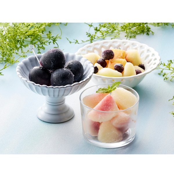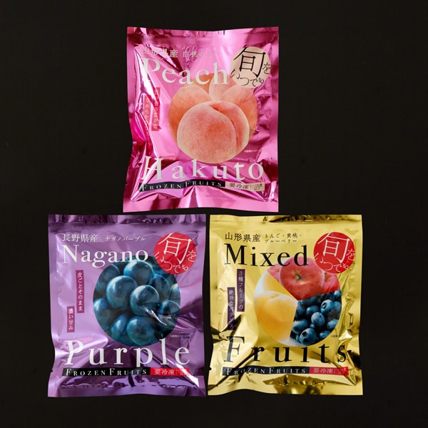 長野で育った深い紫色の美しい果皮のナガノパープルと、山形で育った完熟の白桃、それとりんごと黄桃、ブルーベリーをミックスしたパックの3種を一番おいしい旬のタイミングで、急速冷凍しました。半解凍でシャーベットでお召し上がりいただくほか、ジュースやお酒の氷の代わりとして、スムージーやデザートのトッピングなど、フルーツ本来の香りや甘さをお楽しみください。
