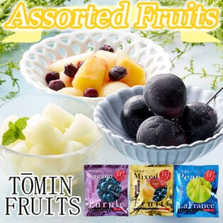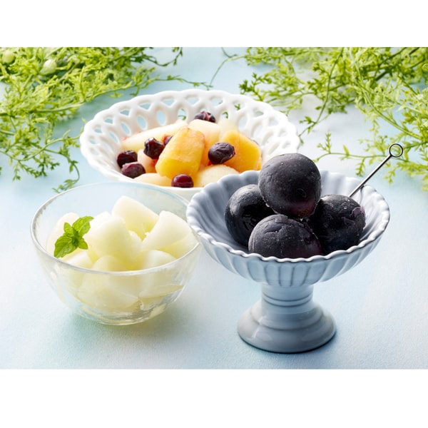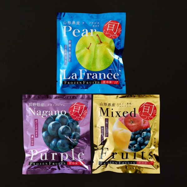 長野で育った深い紫色の美しい果皮のナガノパープルと、山形で育った歯触りのいい甘くてジューシーなラ・フランス(洋ナシ)、それとりんごと黄桃、ブルーベリーをミックスしたパックの3種を一番おいしい旬のタイミングで、急速冷凍しました。半解凍でシャーベットでお召し上がりいただくほか、ジュースやお酒の氷の代わりとして、スムージーやデザートのトッピングなど、フルーツ本来の香りや甘さをお楽しみください。