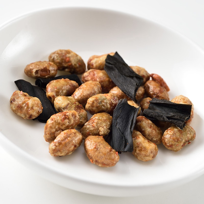 オリジナルの味噌と唐辛子で味付けをした和風のピリ辛味大豆です。ミニサイズ商品は北海道産の昆布スナックがいいアクセントになっております。