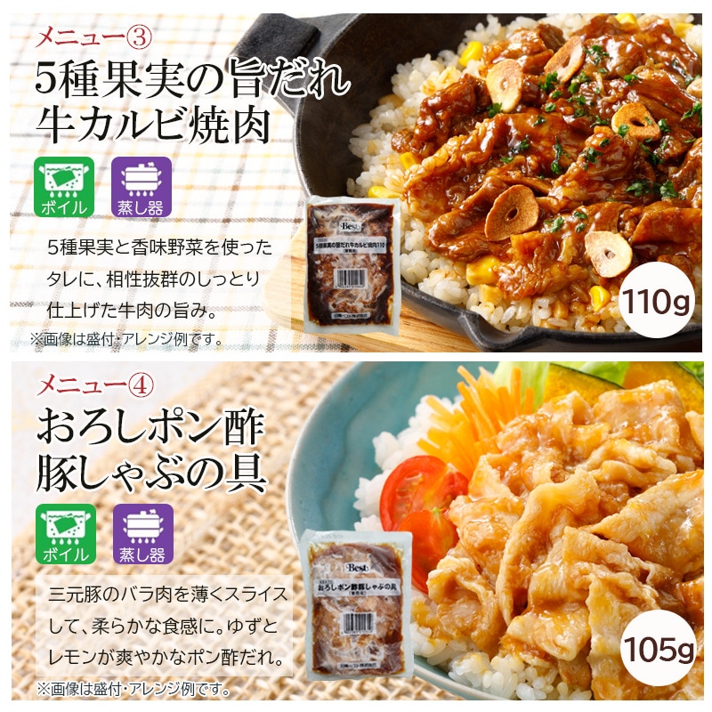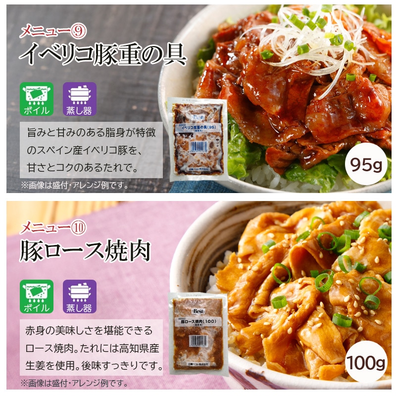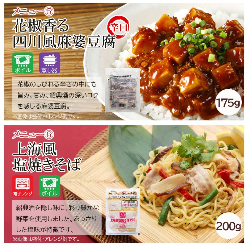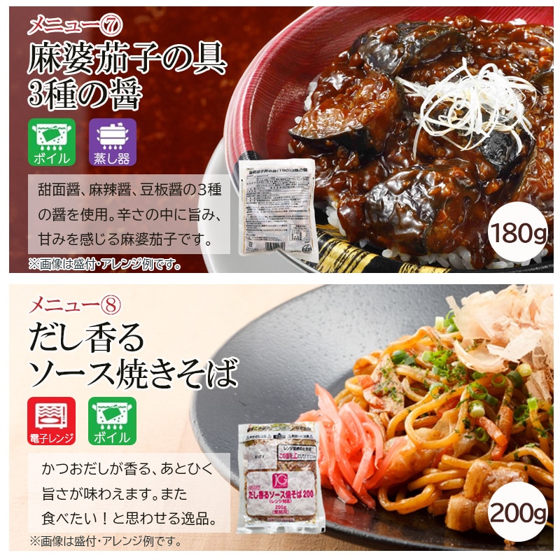 牛丼の素、ハンバーグ、焼きそば、麻婆豆腐など人気の商品をセットにしました。
