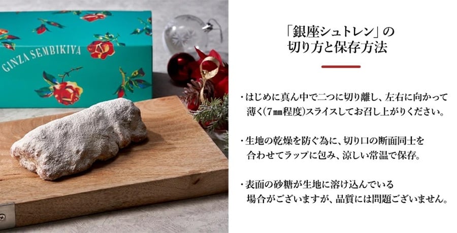 日が経つにつれて、ドライフルーツの風味、マジパンに含まれる水分が生地に馴染み、しっとり感が高まり、味わい深くなる味の変化を楽しめるのがシュトレンの醍醐味です。