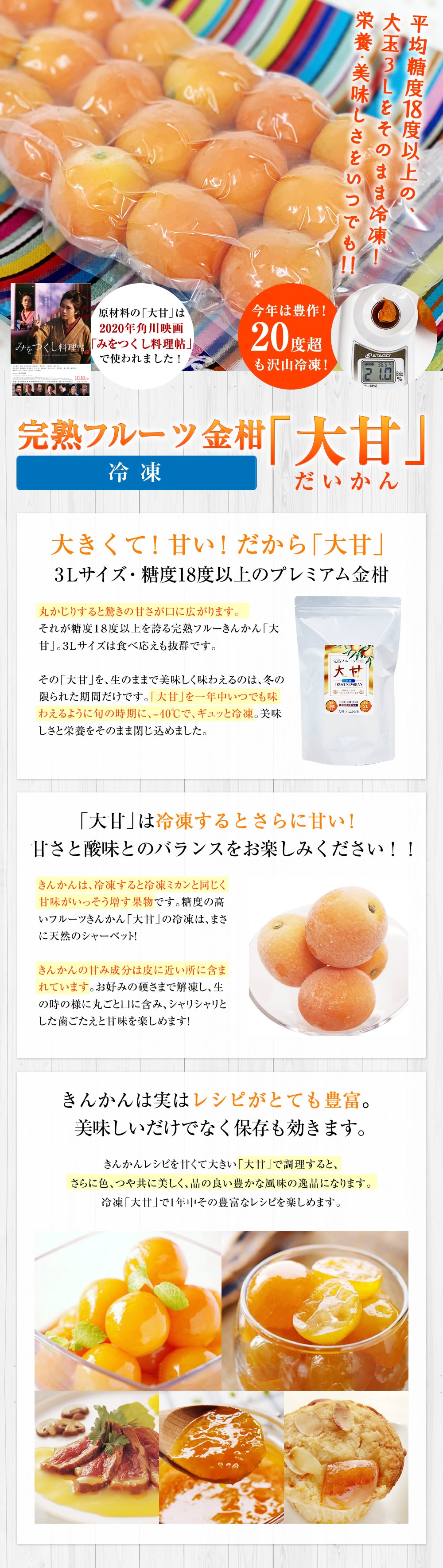 【500g×3袋】冷凍フルーツ金柑「大甘(だいかん)」3Lサイズ | 大きくて甘いブランド金柑「大甘」の旬の甘さと栄養そのまま冷凍 。冷凍で甘さがさらにアップ!