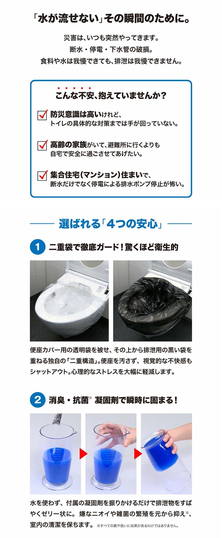 本製品は、防災のプロである「防災士」が監修。家族の安心を守るために必要な機能を凝縮した、お得で安心なトイレセットです。