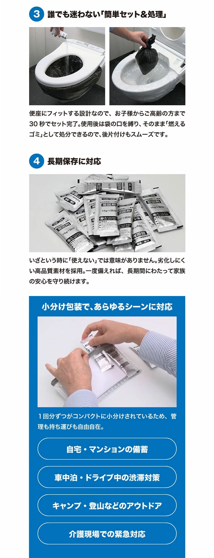 強力な「消臭・抗菌効果」で二次被害を防ぐ優れた消臭・抗菌効果を持つ高吸水性ポリマーの凝固剤を採用。尿や便を素早くゼリー状に固め、気になるニオイを閉じ込めます。避難生活でストレスになりやすい衛生面を強力にサポートします。