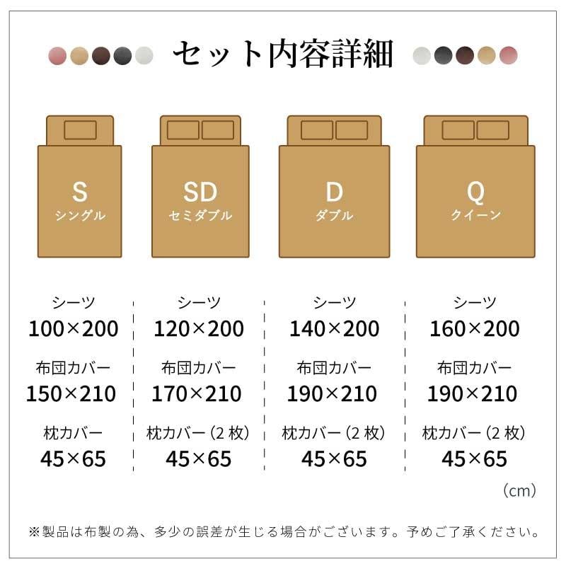 ボックスシーツ(1枚)160*200cm 掛け布団カバー(1枚)190*210cm 枕カバー(2枚)45*65cm