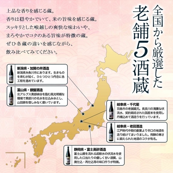 5酒蔵の『純米大吟醸』飲み比べセット! 香り華やかな大吟醸。ぜひワイングラスでお楽しみください。