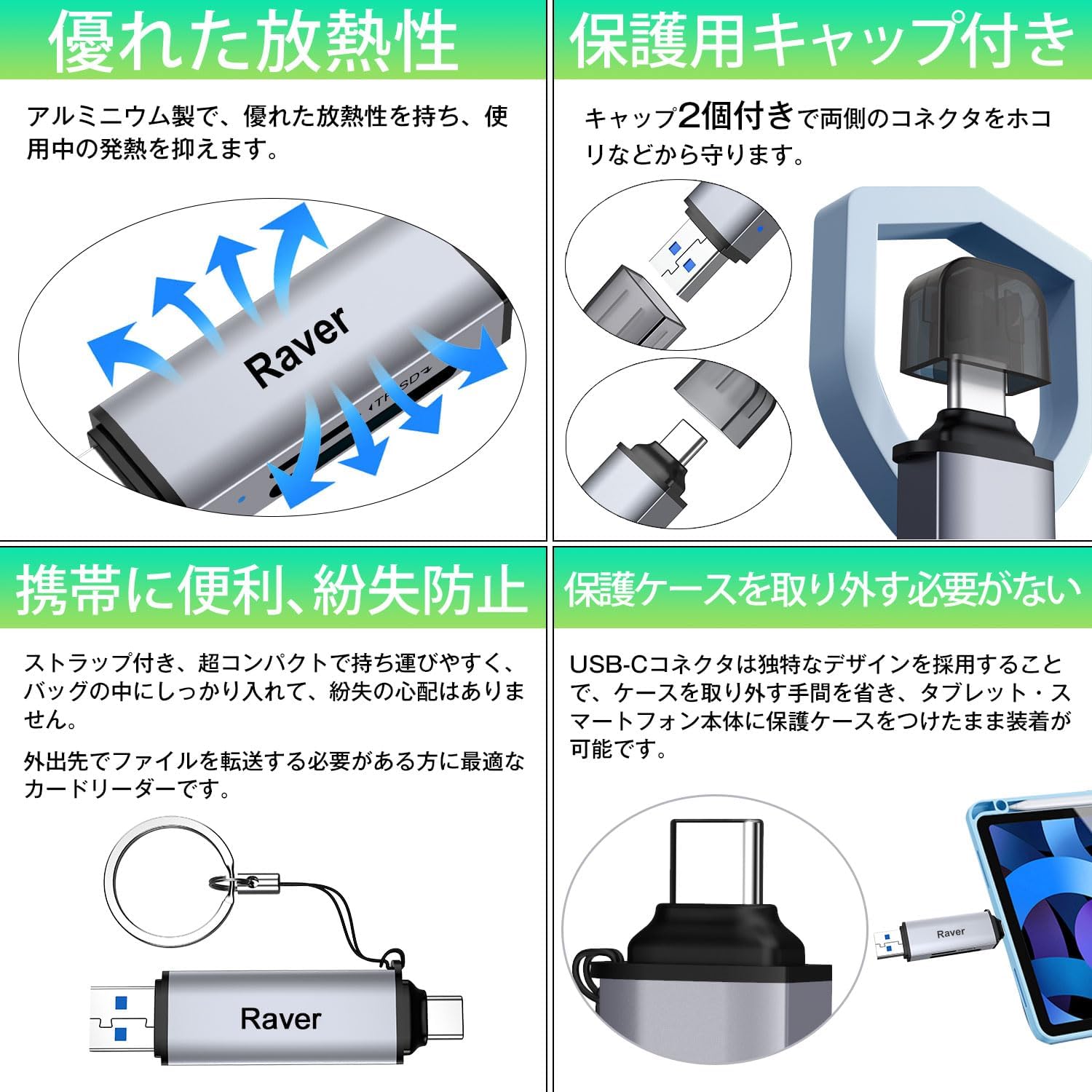 ■デザイン:コンパクトで丈夫な設計により、外出先でファイルを転送する必要がある方に最適なポータブルメモリーカードリーダーです;キャップ2個付きで両側のコネクタを守る。