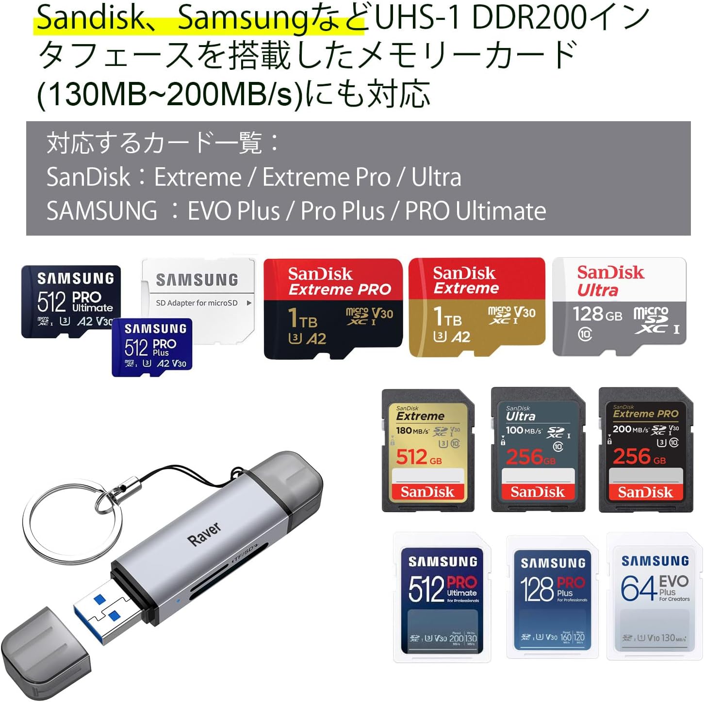 ■190MB/s 高速データ転送:本製品はUHS-I DDR200 モード、SDR104 モード、USB 3.2 Gen 1に対応し、最大5Gbpsの高速データ転送で動画や音楽、写真フォルダなどを簡単に同期できます。最大転送速度 DDR200モード:190MB/s、SDR104モード:104MB/s。Sandisk、SamsungなどUHS-1 DDR200インタフェースを搭載したメモリーカード(130MB-200MB/s)にも対応します。(例:Sandisk:Extreme/Extreme Pro/Ultra;Samsung :EVO Plus / Pro Plus / PRO Ultimateなど)