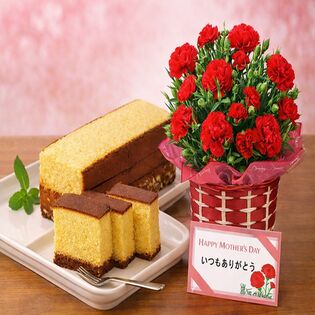 - 母の日 2026 ギフト カーネーション レッド5号鉢&カステラ約150gノーカット セット